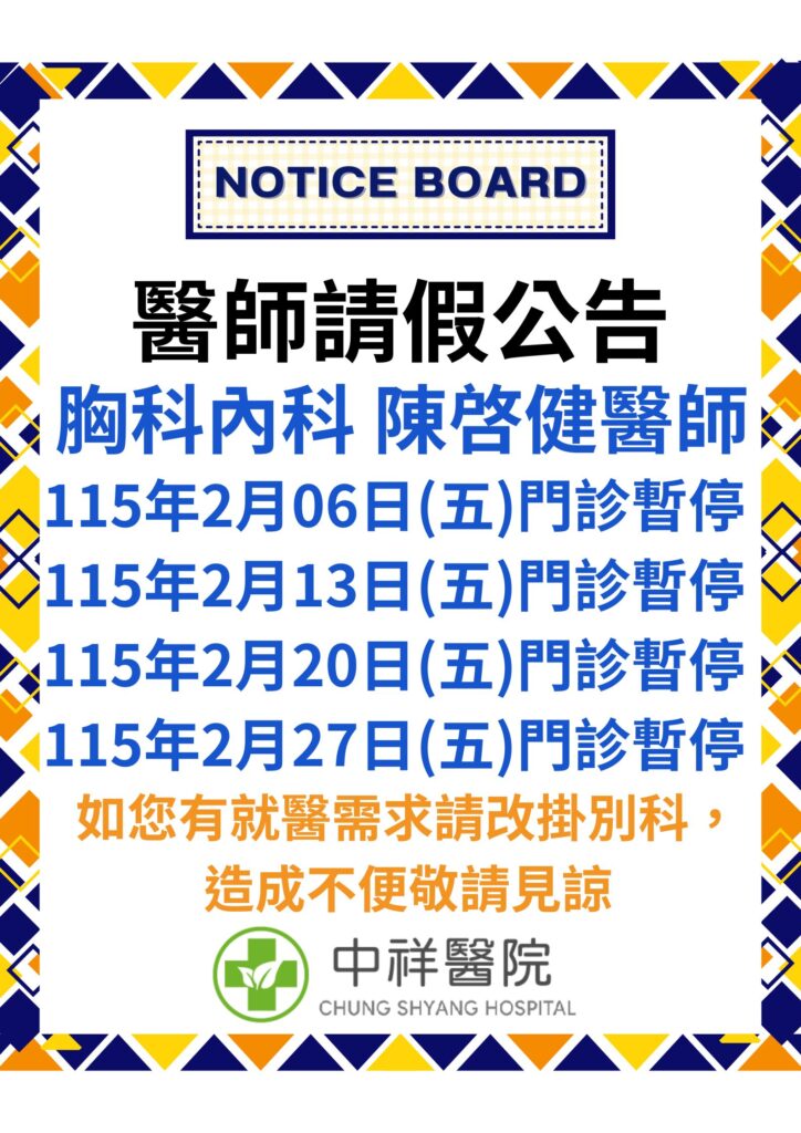 115年2月份之週五中祥醫院陳醫師請假公告