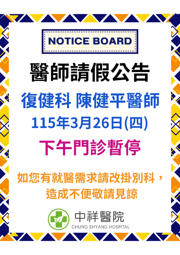 115年2月23日(一)中祥醫院醫師臨時請假公告