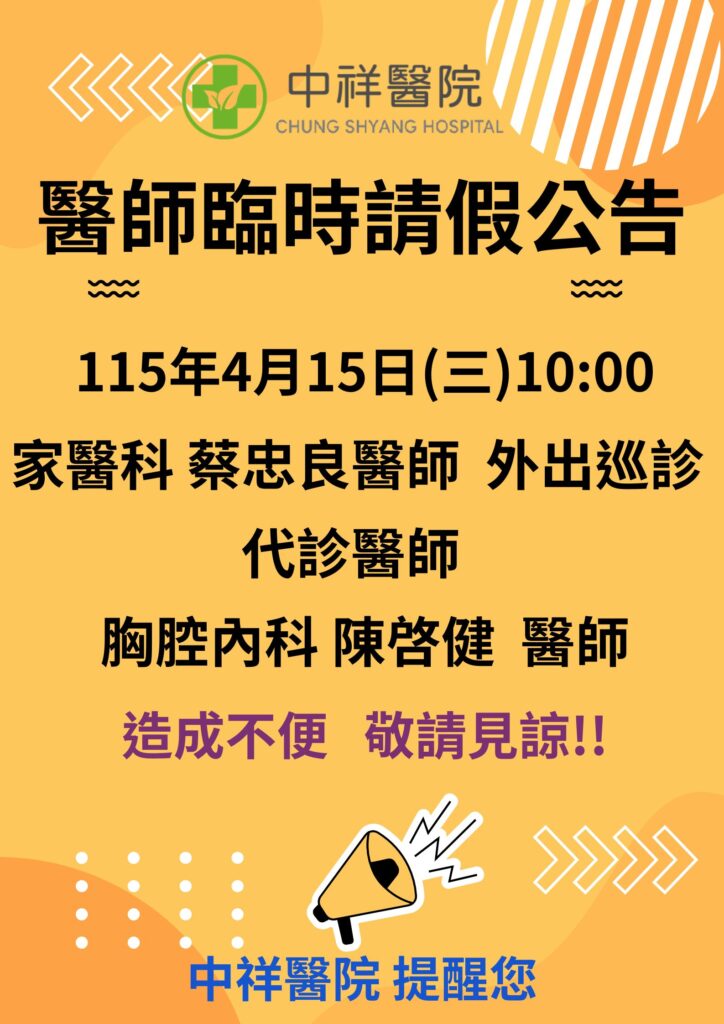 115年4月15日(三)中祥醫院醫師臨時請假公告